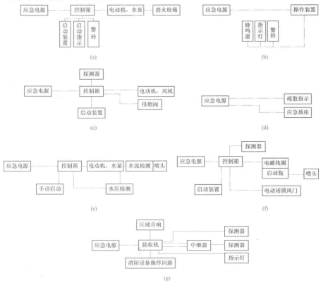 (a)消火栓灭火系统;(b)声、光报警装置;(c)防排烟系统;(d)疏散诱导及应急插座装置;(e)自动水喷淋灭火系统;